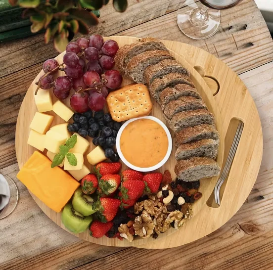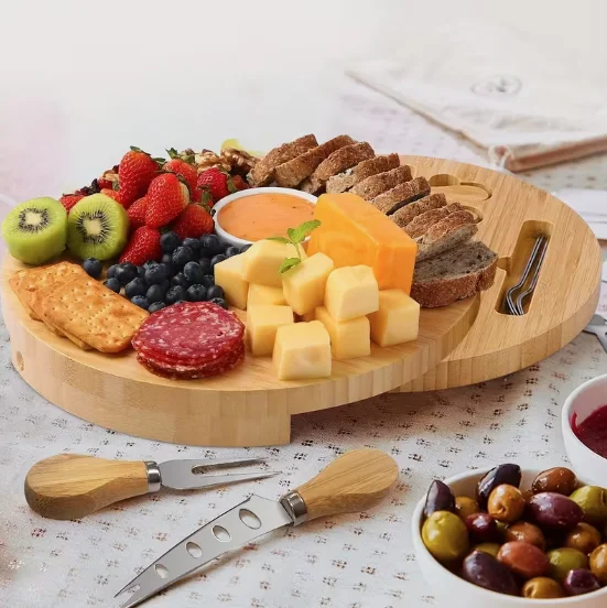 Eleganta, apaļa uzkodu paplāte stilīgai sieru, gaļas uzkodu, augļu un riekstu pasniegšanai. Komplektā ietilpst atvilktnē paslēpti nerūsējošā tērauda piederumi ar koka rokturiem – naži, dakšiņa un lāpstiņa ērtai servēšanai.