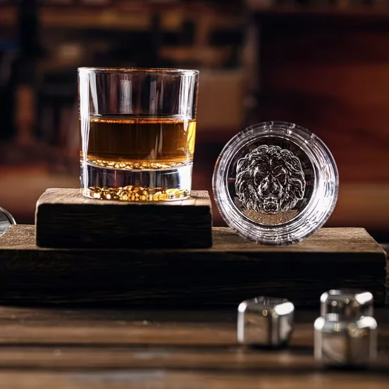Elegantas un izsmalcināta dizaina viskija glāzes, kuru apakšdaļā iestrādāts trīsdimensiju lauvas galvas motīvs. Katra glāze izskatās solīda un pievilcīga, tāpēc lieliski piemērota gan ikdienas lietošanai, gan īpašiem notikumiem.
